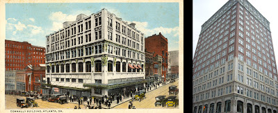 designed by w. l. stoddart, who also designed the ga. terrace and the ponce apts., was begun in 1916, but construction was interrupted by world war i and not resumed after the war --- in 1995 an additional ten stories were constructed and it was re-opened as a hotel, which didn't last long --- then it was eaten by ga. state, which has now burped it back up again, to be reborn as a comfort suites hotel --- a first for south of the tracks and something that will get a lot of use from visitors to the various agencies in the federal center, just a block to the west ---